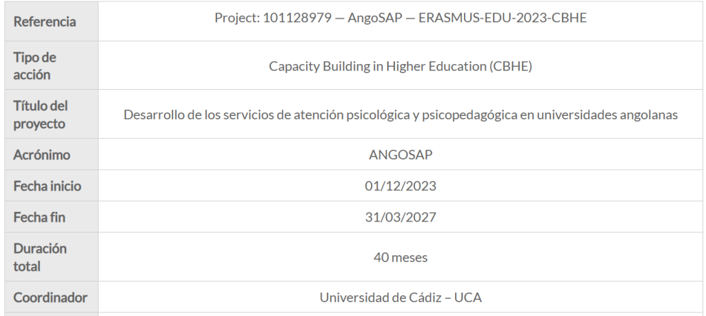 El Proyecto internacional Erasmus+ AngoSAP ha aprobado una extensión de cuatro meses en su calendario de ejecución, ampliando su duración total de 36 a 40 meses. Con esta decisión, el Proyecto continuará desarrollándose hasta finales de marzo de 2027, con el objetivo de garantizar la consolidación y sostenibilidad de los Centros de Diagnóstico y Orientación Psicológica (CDOPs) implementados en las universidades participantes de Angola.